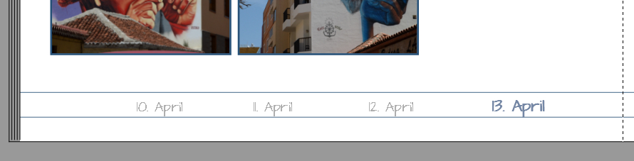 Die Leiste zieht sich durch das ganze Buch, d.h. man kopiert sie von Seite zu Seite, wobei praktischerweise zunächst alle Informationen gleich formatiert sind. Ich mag ein helles Grau dafür gern. Auf jeder Doppelseite hebt man dann die entsprechende Info - das Datum, das Ausflugsziel ... – farblich ab, z.B. in schwarz oder in einer zur Seite passenden Farbe, zusätzlich vielleicht auch in Fettdruck oder einer höheren Schriftgröße. Das ist sozusagen eine Imitation der Anzeige am PC, bei der aktive Bereiche farblich markiert sind bzw. inaktive ausgegraut und die wir sofort entsprechend einordnen.
