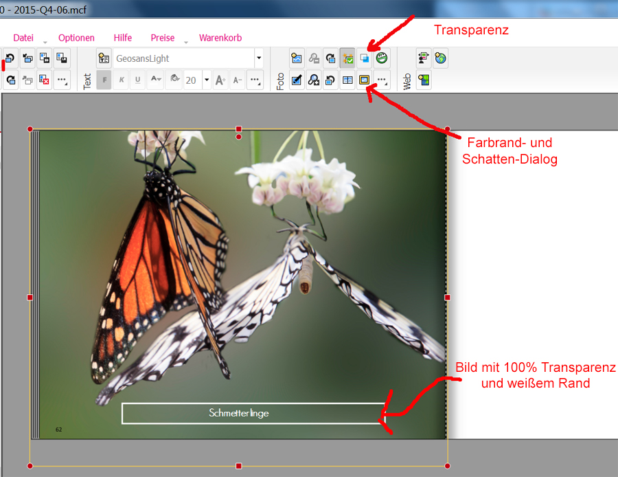 Ich nehme ein beliebiges Bild, markiere es, und setze dann die Transparenz auf 100% (also komplett durchsichtig) und dann mache ich noch mit dem Farbrand-und-Schatten-Dialog einen Rahmen herum. Dieser Rahmen bildet dann meine Linien, die ich dann beliebig dick oder dünn einstellen kann. Und der Hintergrund bleibt sichtbar.