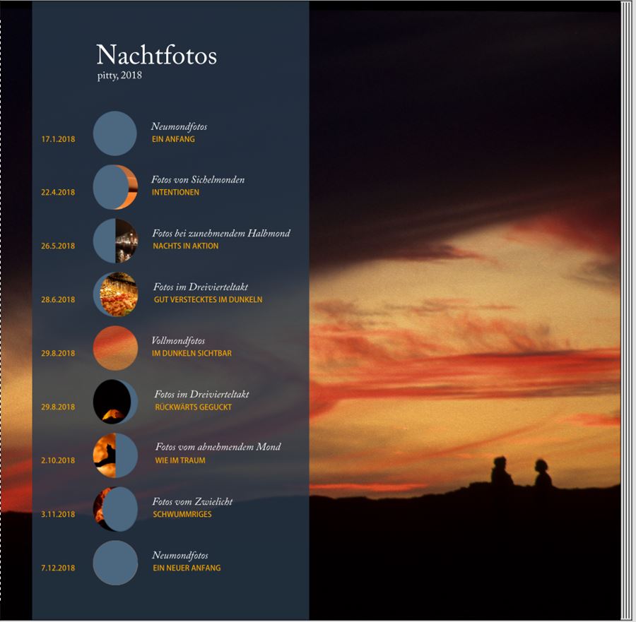 Re: 8. Dezember | Kategorie: KreativesIch bin etwas anders herangegangen und habe mich an eine Interpretation eines Zeitstrahls gemacht. Meine vielen Nachtfotos könnten nach Mondphasen sortiert werden. Das ergibt die Möglichkeit für ein Inhaltsverzeichnis im Bildband.