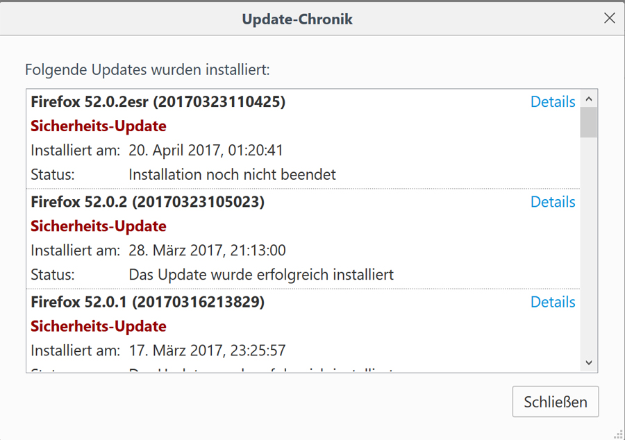Bei mir hat aber offensichtlich heute ein Update bei Firefox (?) nicht funktioniert. Ich habe die Meldung einfach weggeklickt, weiß also nicht genau, um was es ging. Irgandwann gewöhne ich mir an, in solchen Fällen einen Screenshot zu machen, um hinterher noch zu wissen, was war Mal sehen, was die anderen dazu sagen. Liebe Grüße