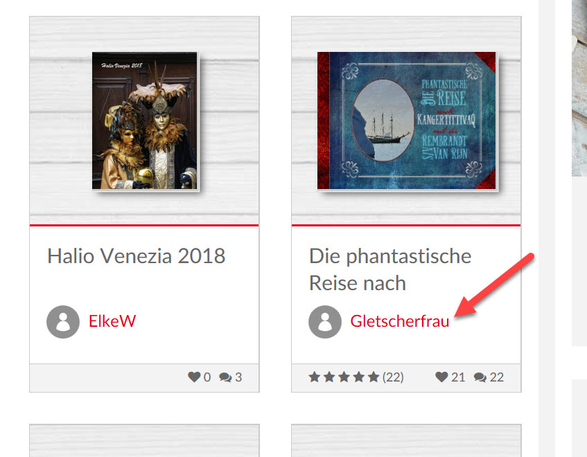 Ich meinte damit: Wenn du bei einem Kundenbeispiel auf den Namen des Autors klickst, werden dir alle seine Fotobücher angezeigt - falls er/sie mehr als eins eingestellt hat.liebe Grüße