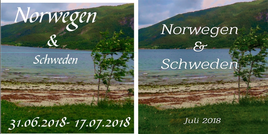 Bei der ersten Innenseite gefällt mir auch die Karte, schade, daß man die Pins kaum sehen kann. Daher finde ich es unnötig weiter hinten wieder so eine große Karte mit Fahne abzubilden. Den großen Text hast du ja schon erklärt, nur hätte ich nicht zwei ähnliche Fonts in italic verwendet. Du hast ein paar wirklich schöne Fotos dabei, manche hätte ich etwas aufgehellt und gerade gerichtet. Ich hab dir ein paar Beispiele angehängt, damit du vielleicht besser erkennen kannst, was ich meine. Beim Cover fällt es durch die Schrift besonders auf. Wenn du ein großes Raster einschaltest, kannst du dich auch daran orientieren. Wasser ist immer waagrecht, außer es ist ein Wasserfall. Dächer und Fensterreihen sind immer waagrecht, Lampenmast senkrecht. --------------------------------------------------- Re: Kundenbeispiel Rundreise durch Norwegen und Schwedenmel-li93 hat geschrieben: Ich würde so gerne neues lernen und wissen was ich besser machen kann oder Euch gefällt.