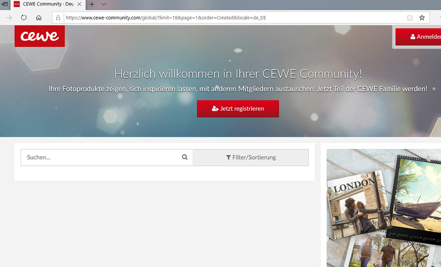 Mein Weg zum Aufruf der Seite war folgender: Internet-Explorer – Aufruf der Seite: https://www.cewe.de/cewe-fotobuch.html - runterscrollen bis Service – Cewe Community Dann öffnet sich dieser Link: https://www.cewe-community.com/global/? ... cale=de_DE Problem/Frage: Bis vor etwa 2 Wochen waren dann alle neuesten Fotobücher der Community sichtbar, das neueste zuerst und unabhängig vom Thema. Jetzt aber erscheint kein einziges Buch. Um überhaupt Inhalte ansehen zu können, muss ich einen Suchbegriff eingeben, z.B. „Südengland“. Mit fehlt jedoch die Gesamtansicht, so wie es früher war. Ich habe es mit Screenshots zur Verdeutlichung festgehalten. Wie kann ich wieder eine Gesamtansicht aller neu eingestellten Fotobücher erreichen? Habe das Problem bereits zweimal mit der Service-Hotline besprochen, die mir leider nicht helfen konnten. Für Eure Hilfe bin ich Euch jetzt schon dankbar. Ich habe auf dem PC Windows 10 und verwende den Microsoft Edge-Internetexplorer. Liebe Grüße Albine Liebe Grüße Albine