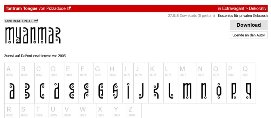 Vielen Dank schon im Voraus! Katrin Re: Wer kennt diese Schrift?Bei dafont gefunden: https://www.dafont.com/de/tantrum-tongu ... xt=MYANMAR