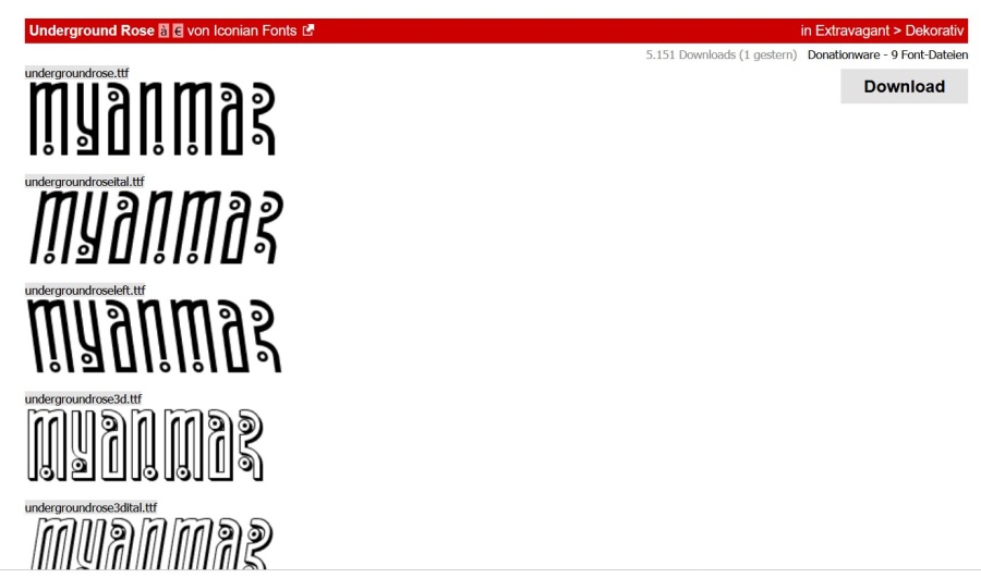 Josefia Re: Wer kennt diese Schrift?Ganz ähnlich, aber mit mehreren Schnitten, ebenfalls von dafont: https://www.dafont.com/de/underground-r ... xt=MYANMAR