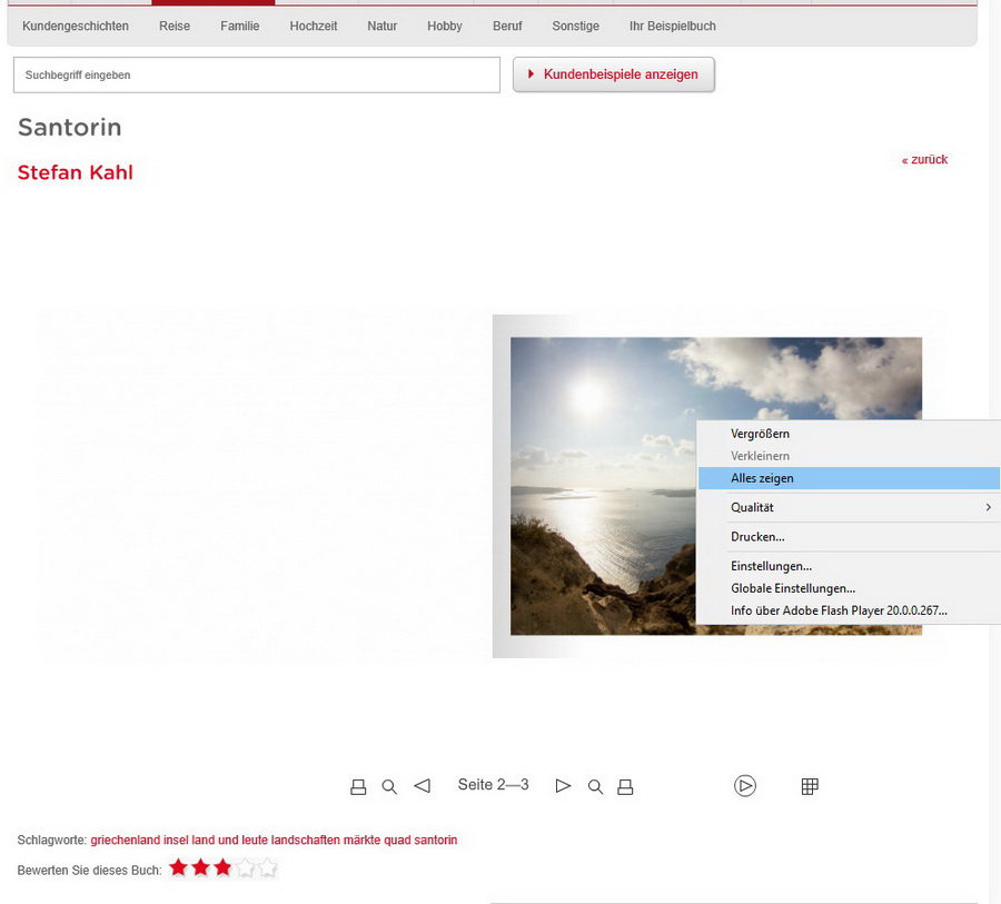 Ich habe ihn neu heruntergeladen, und jetzt habe ich die Navigationsleiste wieder. Grasmücke, danke auch dir für's Testen Schon seltsam, dass die Navi-Leiste bei den Wettbewerbs-Büchern angezeigt wurde und bei den Kundenbeispielen nicht Ich hatte gestern schon versucht, das Flash-Player Menü zu öffnen, aber der Rechtsklick lief ins Leere. Allerdings konnte ich mit den Pfeilen (s. Screenshot) das Fotobuch durchblättern (kenne ich vom Smartphone). Wenn ich jetzt auf "Alles Anzeigen" umschalte, geht gar nichts mehr. Auch Blättern ist nicht mehr möglich. Aber wenn ich die Seite neu lade, oder ein anderes Fotobuch aufrufe, geht es wieder. Danke, jetzt bin ich wieder glücklich liebe Grüße