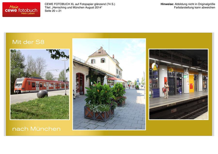 Als ich es mir online betrachtete habe ich einen Riesenschreck bekommen. Die Seiten sehen nicht korrekt aus wie ich Sie auf meinem PC habe. zBsp. die Seite mit der S8 nach München, da ist die untere Textlinie praktisch abgeschnitten. Auch bei anderen Seiten habe ich dies gesehen. Ich hoffe nicht, dass ich das in der gedruckten Version nicht so sein wird https://www.cewe-community.com/global/e ... 2014-31423 Gruss