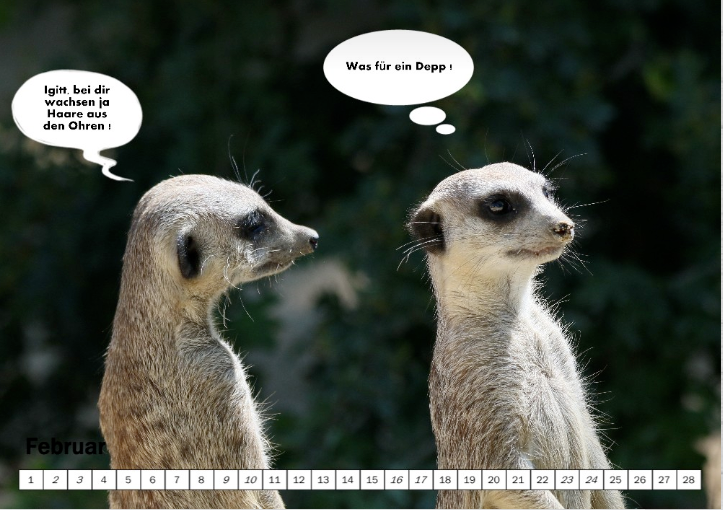 Diese Aufgabe war wirklich gemein und die Ergebnisse sehr lustig. Fotobücher sollen Geschichten erzählen. Oftmals kommt man da nicht ohne erläuternde Texte aus. Mit Sprechblasen und Cliparts lassen sich wunderbare Comics gestalten. Viele schöne Seiten und Anregungen für diese Gestaltungsart findet ihr in diesem Thread: Kreative Gestaltung eines Comics (XMS18) Sylke Re: Fotobücher als ComicIch habe auch noch einen Kalender zum Thema entdeckt. Erdmännchen sind geborene Comic-Helden