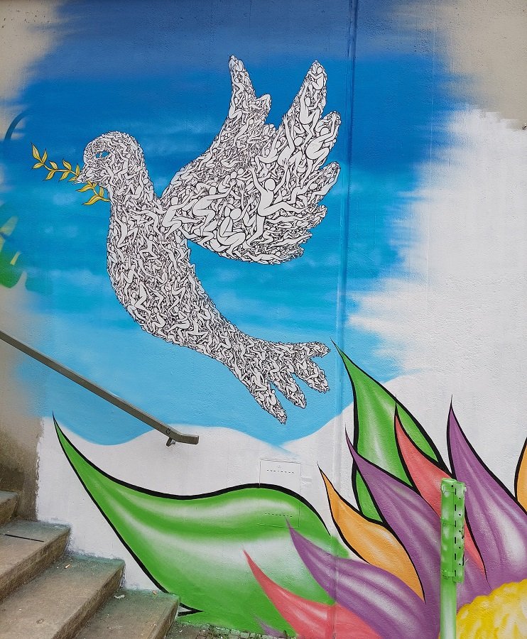 Re: StreetArtEin Teil eines Graffitis mit Friedenstaube an einer Unterführung in München. Die Taube ist mit lauter "Menschen" gestaltet.