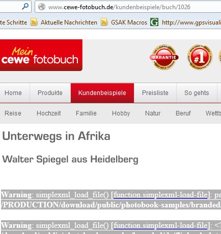 (Ich nutze Firefox) http://www.cewe-fotobuch.de/kundenbeispiele/buch/1026 Warning: simplexml_load_file() [function.simplexml-load-file]: pagedata.xml:1: parser error : parsing XML declaration: '?>' expected in /PRODUCTION/download/public/photobook-samples/branded/de/flipbook-data/FlipBook.php on line 11 Warning: simplexml_load_file() [function.simplexml-load-file]: <?xml version="1.0" standalone="yes" encoding="utf-8"?> in /PRODUCTION/download/public/photobook-samples/branded/de/flipbook-data/FlipBook.php on line 11 Warning: simplexml_load_file() [function.simplexml-load-file]: ^ in /PRODUCTION/download/public/photobook-samples/branded/de/flipbook-data/FlipBook.php on line 11 XML ERROR Gruß dsl-schnell Gruß DSL-schnell