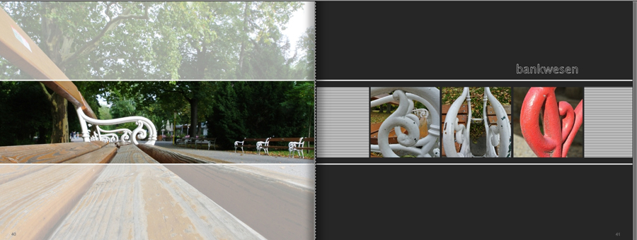 besonders deine Seite mit dem Bankwesen sieht sehr stil- und geschmackvoll aus! Auch ich verändere meinen Gestaltungsstil von Buch zu Buch, weil ich finde, daß es gerade Spaß macht, immer wieder etwas neues - auch durch Anregung hier im Forum - auszuprobieren. Ich habe auch schon jedes Format probiert, derzeit bin ich beim XXL-Format quer gelandet, da ich gerne Panos in meinen Büchern verarbeite. Hier mal ein paar Beispiele aus meinem letzten Buch: LG Bäuerin