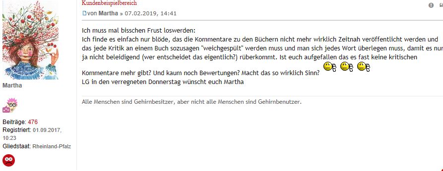 Liebe Martha, das freut mich an sich schon zu wissen, aber zum einen sehe ich keinerlei grüne Smilies, lediglich den von Grasmücke, als ich fragte, was der rote Teufel bedeutet. Sie wollte mir zeigen, wie es aussehen sollte. Ich habe meine Einstellung jetzt so gestellt, das ich nicht bewertet werden möchte, leider kann ich dadurch aber nun auch niemanden anders meine Sterne vergeben. Wie gesagt, ich finde ein System unsinnig, wo ich nicht erfahre, warum ich so bewertet worden bin und von wem um mich gegebenenfalls rechtfertigen zu könnte und ich kann mir auch irgendiwe keinen Reim darauf machen, das man sich an meiner Wortwahl gestört hat...aber gut, ich brauche keine Punkte, ich will nicht zum Guru aufsteigen, also wozu? ich habe lange überlegt, ob ich mich zu dem Thema äußern will. Ich kann deine Enttäuschung über die "roten Teufelchen" verstehen, aber denk doch eher darüber nach, wieviel positive Kritiken du für deine Bücher und wieviele positive Reaktionen du auf die Öffentlichmachung deiner persönlichen Probleme erhalten hast, soviel wie sonst niemand hier im Forum. Allerdings hat auch niemand sonst so viel von sich preisgegeben. Und hier liegt vielleicht das Problem. Vielleicht gibt es Forumsnutzer, die der Meinung sind, dass derartige persönliche Befindlichkeiten nicht in das Forum gehören, vielleicht haben sie sich nicht getraut, an einem deiner Beiträge offen Kritik zu üben, weil man einen Shitstorm durch deine vielen Anhänger befürchtete. Aber wie dem auch sei, es ist einfach so, dass man es nicht jedem recht machen kann. Der legendäre Franz Josef Strauß hat einmal gesagt: „Everybody's darling is everybody's Depp.“ (So steht es im Netz, ich meine allerdings zu erinnern, dass er statt Depp "Rindviech" gesagt!) Und das will schließlich niemand sein. In diesem Sinne wünsche ich, dass sich die Wogen bald glätten und du weiterhin mit Spaß im Forum unterwegs bist. Liebe Grüße Traumfänger Re: Sterne vergebenIch möchte nur kurz was klarstellen, eine Zensur hat es bei meinen Beiträgen bis heute noch nie gegeben. Ich hatte mein Bewertungssystem deaktiviert, somit konnte ich nie sehen, wie mich jemand bewertet und was jemanden stört. War wahrscheinlich ein Fehler, dann hätte ich natürlich nichts mehr geschrieben. Sylke war jetzt so nett und hat mir mitgeteilt, daß ich runterbewertet wurde, erst dann habe ich die Ansicht freigeschalten und konnte die roten Teufelchen re Challenge sehen. Wie Sylke schon schreibt, wurde das Bewertungssystem eingeführt, um sich im positiven und negativen Sinne Luft zu machen. Wenn dies jemand für sich braucht, ok, aber man muß auch den Betroffenen verstehen, denn so weiß man gar nicht weiß warum. Ich habe ein dickes Fell und kann damit sehr gut leben. Sylke hat mir auch mitgeteilt, daß es weder sie noch jemand von CEWE war der mich zum Teufel schickte, sondern eine von euch. Das finde ich natürlich schade, bei Sylke hätte ich es eher nachvollziehen können. Hier, z.B. wurde Reisetante ein Teufelchen verpaßt und Sylke hat dies auch begründet, so finde ich so auch ok.