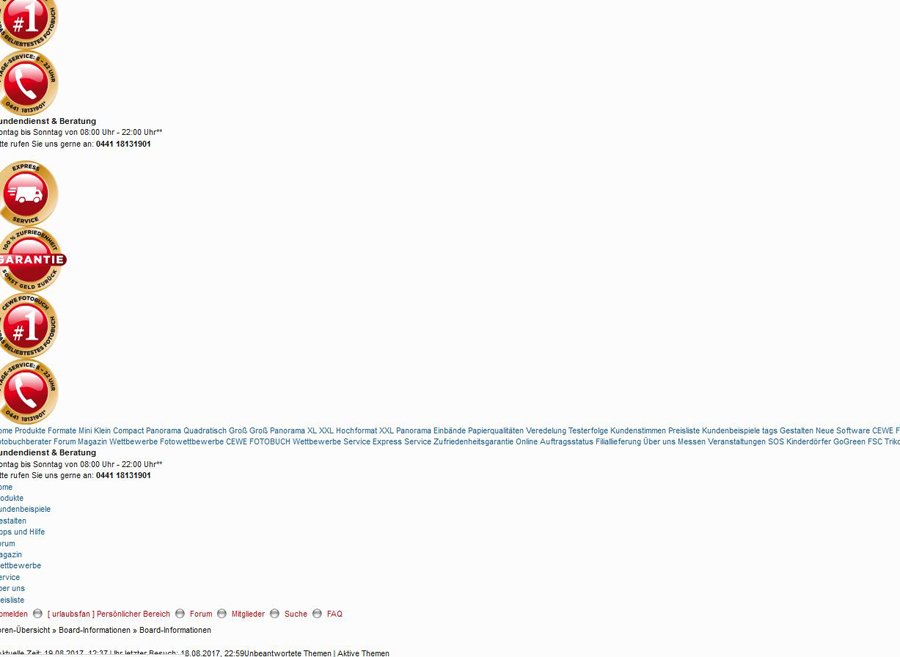 Wir laden Sie herzlich ein, die neue CEWE Community mit integriertem Forum zu entdecken und künftig zu nutzen. Das bisherige Forum, in dem Sie sich gerade befinden, steht nur noch bis Ende 2025 für neue Beiträge zur Verfügung und wird ab dem kommenden Jahr 2026 nur noch lesend zugänglich sein. Informieren und registrieren Sie sich jetzt in der neuen CEWE Community – wir freuen uns auf Sie! Re: Wartungsmodus 26.04.2017Ich habe jetzt meinen Avatar auch neu hochgeladen, ich sehe jetzt auf meinem Laptop Zaubermaus, Silber-Distel und Pe-Foto. Jessica war vorübergehend da, jetzt wieder verschwunden. Ich glaube, es hängt vom Browser ab, was man sieht. Auf Safari (Tablet) Chrome (Handy) und meinem alten Internet-Explorer gibt es keine Avatare. Warum aber Jessica jetzt wieder verschwunden ist, nachdem ich Firefox geschlossen und wieder geöffnet habe, bleibt rätselhaft