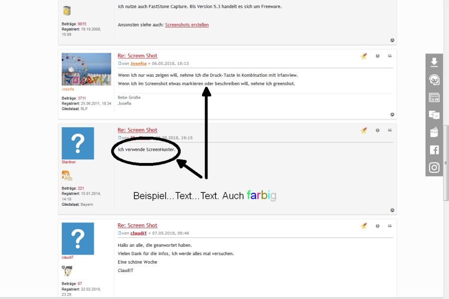 Ja, das geht in irfanview auch und anfangs habe ich meine Anmerkungen auch dort gemacht.Für mich ist Greenshot aber komfortabler, weil man z.B. mehr Schritte rückgängig machen kann. Man kann Elemente (Pfeile, Kästchen, Texte) die man eingefügt hat, später wieder löschen, man kann sie an eine andere Stelle rücken, nachträglich in der Größe verändern oder man kann eingefügte Texte ergänzen oder korrigieren. Das alles geht in irfanview (das ja ansonsten mein Lieblings-/Standardprogrammn ist) nicht und da ich ja manchmal "Romane" in meine Screenshots schreibe liebe Grüße