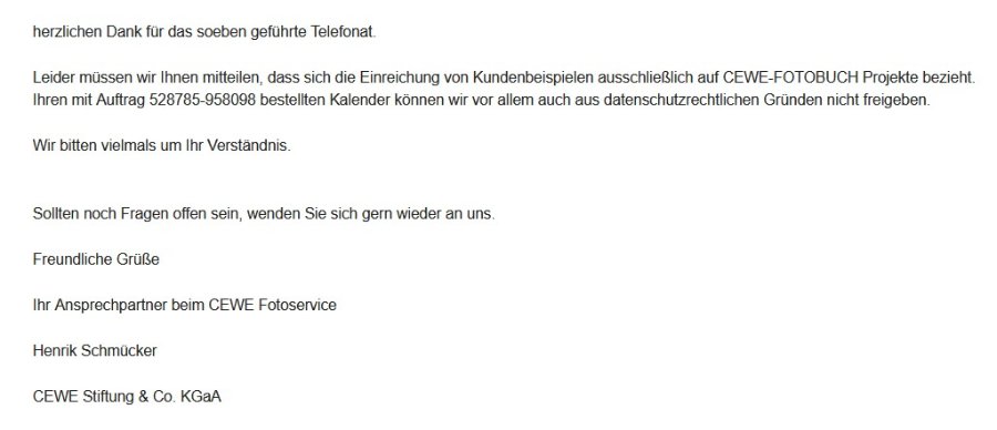 Am Montag dieser Woche habe ich einen Fotokalender, sämtliche Fotos sind aus der Vogelwelt, als Kundenbeispiel eingereicht. Am gleichen Tag erhielt ich von CEWE eine Mail, in der ich gebeten wurde, zu bestätigen, dass ich mein Kundenbeispiel zur öffentlichen Einsicht freigeben möchte (siehe Anlage 1). Die Bestätigung wurde von mir durchgeführt. Soweit, so gut.