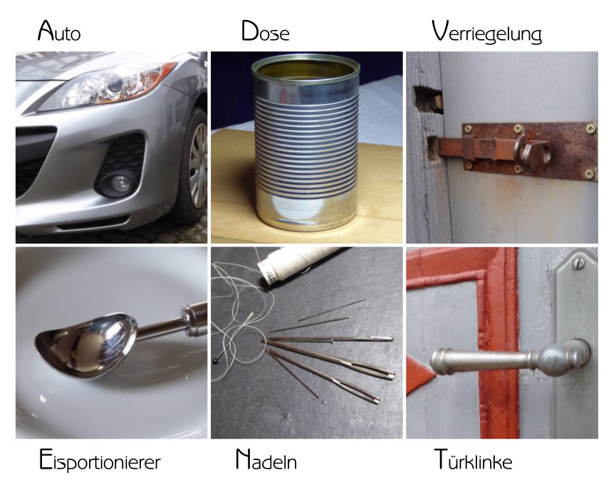 Apfel, Desinfektionsmittel, Verschlussdeckel, Ettikett (ich war mir nicht sicher, ob VW-Bus zählt, aber es ist eindeutig ein Preis-Ettiket drauf ;-) ), Niete, Tastatur