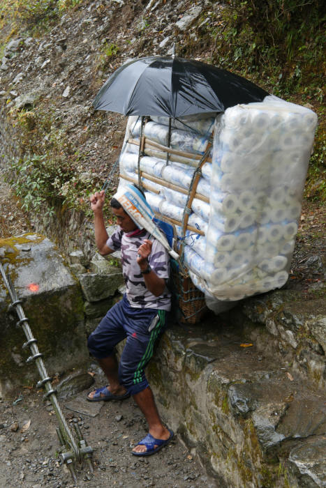Aber in dieser Konstellation ist es eher lustig, oder traurig, wie man es nimmt. Was der Haufen wohl wiegt? Und es regnet stundenlang, es ist saukalt. Und wer weiß, wie weit der arme Mann damit noch laufen muss. Und wenn es nass wird, ist es hinüber. Anfang November, in Nepal. Viele Grüße - Gletscherfrau