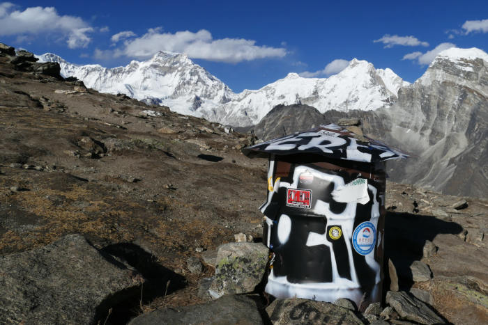Re: 22. Dezember | Kategorie: FotografieEine Mülltonne, wenn auch eine sehr besondere. Diese steht auf 5300 m Höhe und wird bestimmt nie geleert. Im Hintergrund ganz links der Cho Oyu, ein Achttausender.