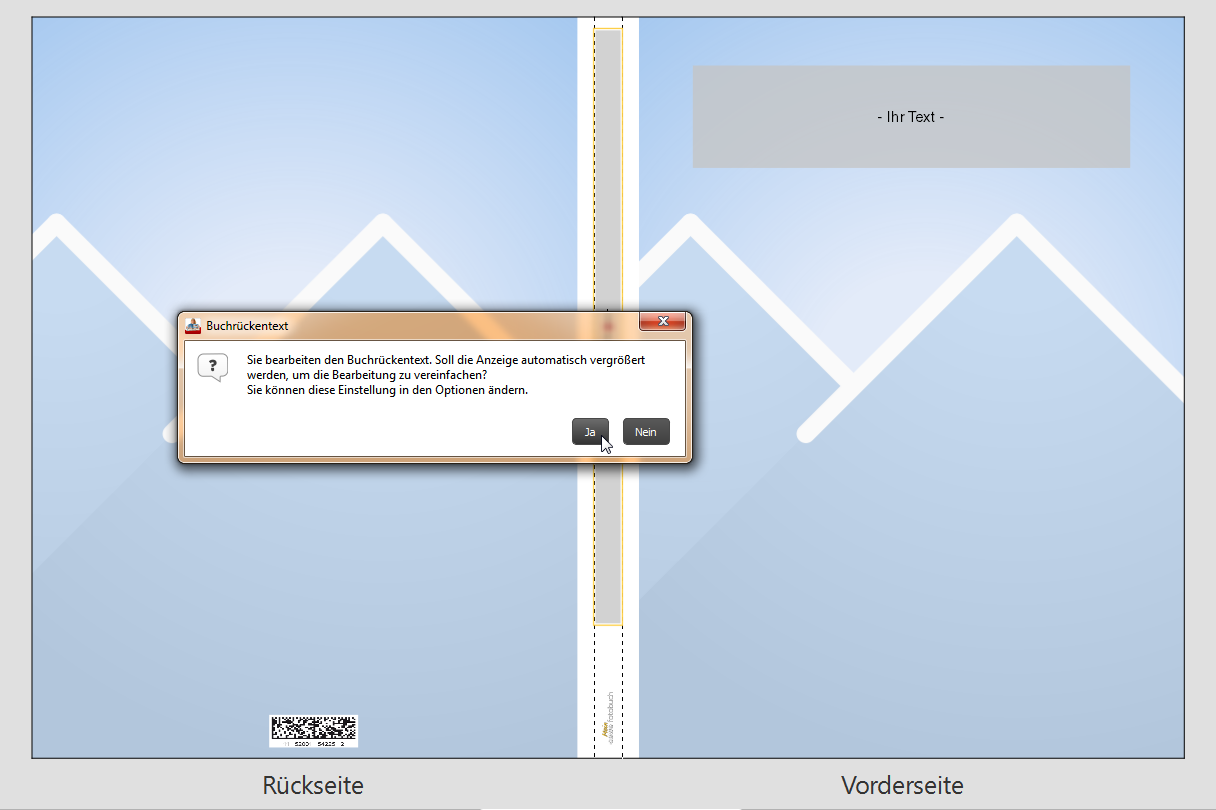 Um Ihnen die Bearbeitung des Buchrückentextes zu erleichtern, können Sie die Ansicht automatisch zoomen.