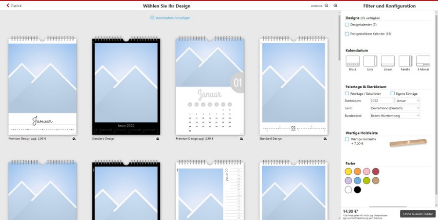 Unsere Kalender-Designauswahl wurde für Sie noch einfacher und übersichtlicher gestaltet. Sie haben nun zusätzlich die Möglichkeit Extras, wie die wertige Holzleiste, dazu zuwählen.