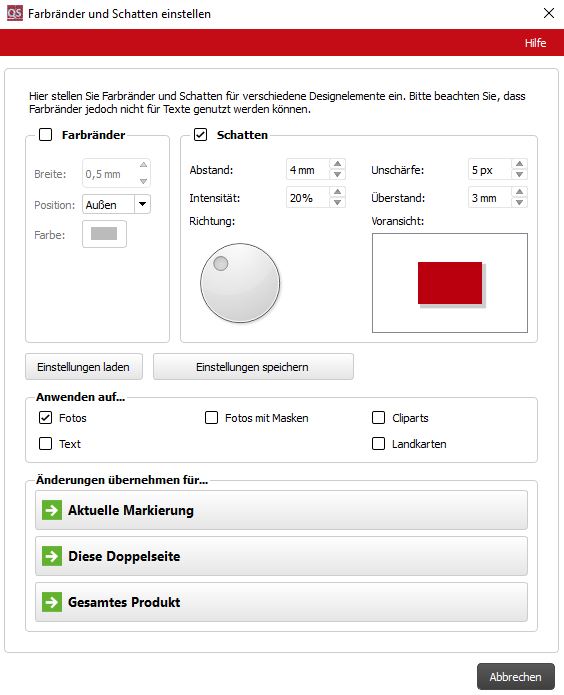 würden Sie mir nähere Angaben zu Ihrem System machen? Wurden alle Updates von Microsoft installiert? Des Weiteren wäre interessant, ob Sie einen Grafikkartentreiber von Microsoft verwenden oder das Original vom Hersteller. Sollten Sie nicht den Treiber des Grafikkartenherstellers verwenden, so installieren Sie diesen bitte. Wenn ich mit meiner Vermutung richtig liege, können Sie danach mit der Version 6.3.1 arbeiten. Sobald wir die Ursache Ihrer Abstürze lokalisiert haben, können Sie mit Version 6.3.x auf viele neue Möglichkeiten zugreifen, die Ihnen sicherlich Freude bereiten. Jede Version beinhaltet Verbesserungen und Fehlerkorrekturen, wie z.B. die Optimierung der Schatten. Eine Bereitstellung älterer Versionen ist leider nicht möglich. Auch wenn es etwas Zeit in Anspruch nimmt, lohnt sich die Überarbeitung der Schatten. Diese können Sie einzeln, für die gesamte Doppelseite oder das gesamte Produkt neu setzen. Sylke Re: Altes Fotobuch - Version 5.1.3 gesuchtCarry hat geschrieben:
