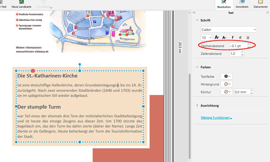 Beim Duplizieren einer Doppelseite auf die nächste leere Seite scheint jetzt alles in Ordnung zu sein. Sowohl der Zeichenabstand als auch der Rand-/Innenabstand bei Textfeldern werden richtig übertragen. Das gilt auch für die vertikale Ausrichtung des Textes OBEN - MITTE - UNTEN Anders sieht es beim Kopieren/Einfügen von Textfeldern aus. Im Test habe ich drei Texte untereinander geschrieben mit den Zeichenabständen -0,6 pt, 0 pt und +0,6 pt. Je nachdem welches der drei Textfelder ich vor der Maskierung (mittels "Gummibandmethode ") zuletzt mit dem Cursor angeklickt hatte, dessen Werte wurden beim Kopieren/Einfügen übertragen. Das heißt, die Zeichenabstände lagen nach dem Kopieren/Einfügen bei allen drei Textfeldern entweder bei -0,6pt oder bei 0 pt oder bei +0,6 pt. (Ich hoffe, dass ich mich verständlich ausgedrückt habe.) Falls es wichtig sein sollte, mein Testbuch hat das Format Groß Panorama, Digital matt und Schriftart war Verdana, Größe 10: Meine Beobachtungen zum Rand-/Innenabstand sowie zur vertikalen Textausrichtung werde ich im oben verlinkten Tread noch näher erläutern. Liebe Grüße