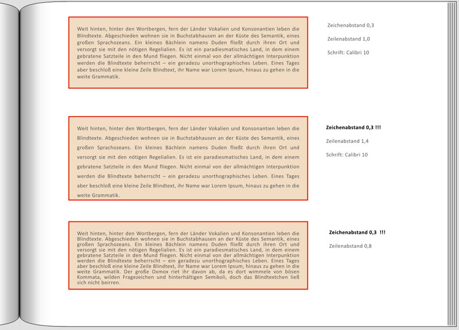 Versionsnummer: 7.3.1 Handelspartner: CEWE Beschreibung: In diesem Thread haben wir schon ausführlich beschrieben, dass der Randabstand bei Textfeldern durch das Kopieren/Einfügen einer (Doppel-)Seite immer wieder zurückgesetzt wird. Ähnliches passiert auch mit dem Zeichenabstand beim Duplizieren einer Doppelseite auf die nächste leere Seite. Hier wurde in beiden Textfeldern der Zeichenabstand von -0,1 pt auf 0,0 pt erhöht. Besonders deutlich wird das bei dem Textfeld auf der linken Seite, weil hier durch den erweiterten Zeichenabstand eine Zeile hinzugekommen ist und der Text weiter nach unten reicht. Der Innenabstand beträgt bei allen Textfeldern 0,0 mm, darunter liegt ein Clipart Farbe. Den Text im zweiten Beispiel habe ich zwar aus dem Internet gezogen, aber alle Formatierungen durch das Zwischenspeichern in "Notepad" vorher entfernt. Liebe Grüße
