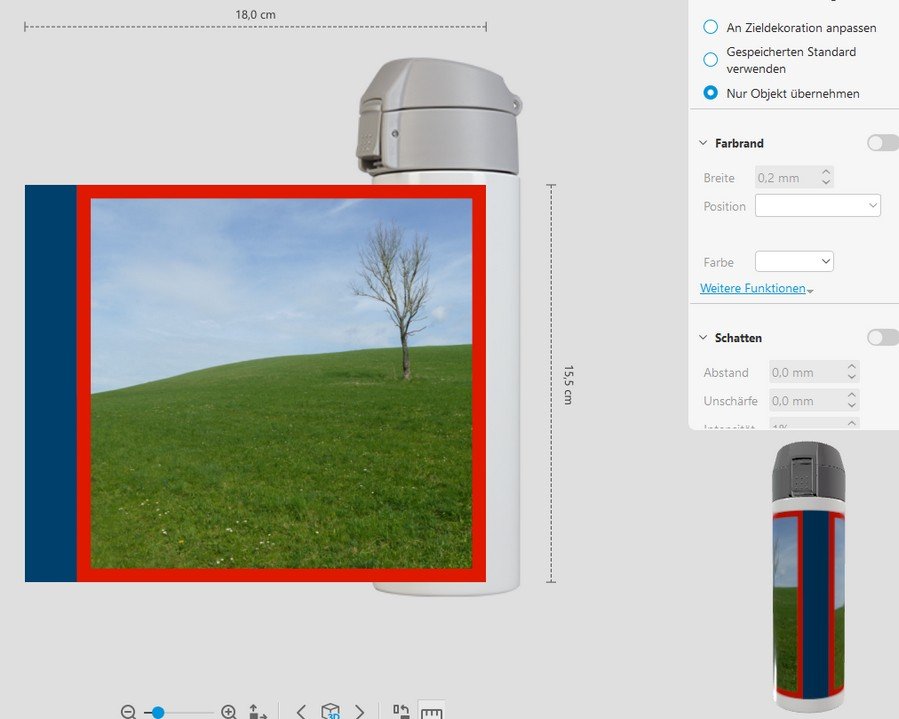 Versionsnummer: 8.0.1 Beschreibung: In der Gestaltungssoftware wird der Thermobecher in der Vorschau falsch angezeigt. Das betrifft sowohl die 3D-Vorschau als auch das kleine rotierende Vorschaubild in der rechten unteren Ecke. Es sieht in beiden Fällen so aus, als könne man den Becher rundum bedrucken. Im fertigen Produkt bleibt allerdings ein Streifen frei. Das ist besonders irreführend, da das auch in der Produktinformation nicht erwähnt ist. Eine Angabe des Gesamtumfangs wäre hier sowieso hilfreich, um die unbedruckte Fläche beim Design berücksichtigen zu können. Was mir außerdem noch aufgefallen ist: Die bedruckbare Höhe ist in der Software und auf der Website mit 15,5cm angegeben. Nachgemessen sind es aber nur 15cm. Soweit ich sehen kann, wurden die Bilder aber vollständig gedruckt, so wie sie auch in der Software angezeigt werden. Vermutlich ist die Breite also auch entsprechend skaliert (ganz genau nachmessen kann ich gerade wegen der Rundung nicht, aber es scheint näher an den so zu erwartenden 17,4cm zu liegen als an 18cm). Das alleine erklärt aber natürlich noch nicht den mehrere Zentimeter breiten unbedruckten Streifen. Re: Thermobecher: Vorschau und bedruckbare Maße sind falschIn der Tat müsste bei vollständiger Beibehaltung des vorgegebenen Platzhalters eine Rundumbedruckung (übrigens 18 cm laut Software-Lineal) erzielt werden.