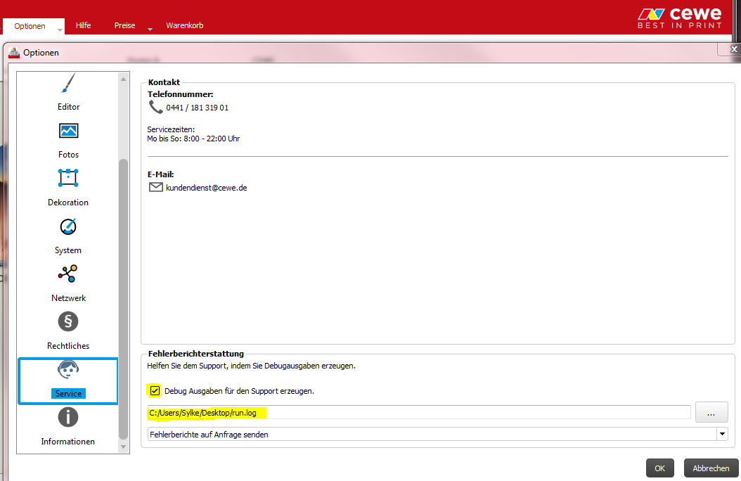 das ist schade! So schnell gebe ich nicht auf. Mögen Sie mir ein Logfile zusenden? Wir haben schon einige gesichtet, aber vielleicht bringt Ihre Aufzeichnung den entscheidenden Hinweis. Setzen Sie dazu in den Optionen den Haken bei "Debug Ausgaben für den Support erzeugen" und starten Sie dann die Software erneut. Die *.log finden Sie in dem zuvor festgelegten Speicherort. Senden Sie diese Datei bitte an die folgende Adresse. Betreff: Startseite/Produktseite defekt | User: Starliner Adresse: forum@cewe.de Vielen Dank für Ihre Geduld und Unterstützung! Sylke Re: Startseite/Produktseite defektEmail mit logfile ist unterwegs...