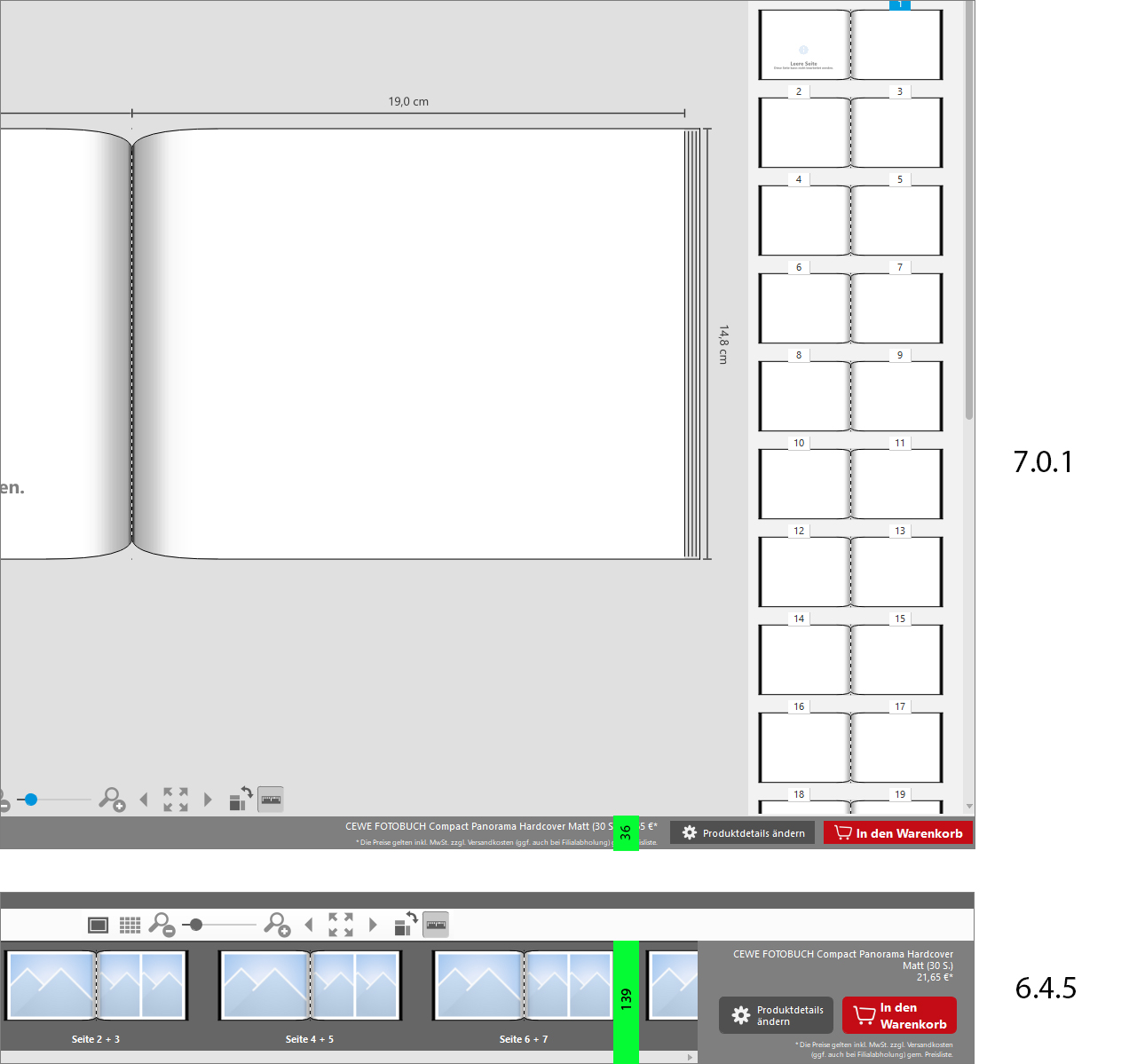 Ich hatte diesen Eindruck noch nie und habe es jetzt bei meinem Monitor auch mal genauer wissen wollen. Ich halte auch nicht soviel davon, wenn man zwingend einzelne Paletten vorübergehend ausblenden muss, um den gewohnten Arbeitsbereich zurückzugewinnen. Lediglich das Storyboard (oder jetzt Miniaturansicht) halte ich für zeitweise entbehrlich. Dabei ist es jetzt recht komfortabel, mit F5 und F7 zwischen "ausgeblendet" und "unten" zu wechseln. Deshalb habe ich bei meinem Test berücksichtigt, dass neben dem Navigationspanel links auch die Objektauswahl und rechts die übersichtliche Werkzeugpalette eingeblendet bleiben. Außerdem soll das Fotobuch vollständig ohne Zoom sichtbar sein. Der Vergleich zischender Version 6.4.4 und der Version 7.0.1 liefert für ein quadratisches "Fotobuch XL" folgende Ergebnisse (Breite in cm an meinem Bildschirm gemessen). Version 6.4.4 mit Storyboard unten: 34,2 cm verfügbare Bildschirmbreite Version 6.4.4 mit Storyboard rechts: 32,5 cm verfügbare Bildschirmbreite Version 7.0.1 mit Storyboard unten: 32,5 cm verfügbare Bildschirmbreite Version 7.0.1 ohne Storyboard: 34,3 cm verfügbare Bildschirmbreite Der verfügbare Bereich wird in der neuen Version 7.0.1 also kaum bis gar nicht eingeschränkt. Ähnlich nah beieinander liegen die Werte bei einem hochformatigem "Fotobuch Groß" Re: Version 7.0.0 bzw. 7.0.1 verbessert?Hallo Okular,
