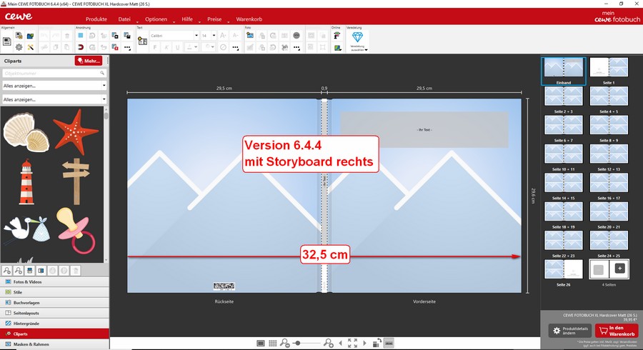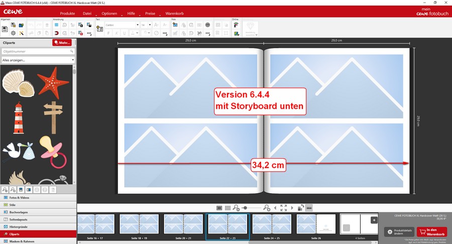 nach dem ersten Start der Software sind alle Paletten komplett geöffnet, um einen ersten Überblick zu gewähren. Ähnlich wie Sie es von anderen Anwendungen vielleicht kennen, können Sie sich einrichten. Das heißt, Paletten verkleinern, nicht relevante oder nicht laufend verwendete Paletten ausblenden usw. Sie haben alles eingeblendet und der linke Bereich ist auch nicht verkleinert. Dadurch haben Sie natürlich weniger Platz in der Breite. Lassen Sie mich mit einer gängigen Auflösung (1920x1200) einen Vergleich anstellen: Die Werkzeugleiste im oberen Bereich ist deutlich schmaler geworden und auch das Storyboard, sofern Sie dieses im unteren Bereich nutzen, lässt sich während der Bearbeitung ausblenden. In der Höhe haben Sie somit deutlich mehr Platz gewonnen. In der Breite ist es ähnlich. Sie können die linke Leiste verkleinern, dann sehen Sie nur die kleinen Icons. Das Auswahlfenster lässt sich, sofern Sie das Minimum noch nicht erreicht haben, etwas zusammen schieben. Wenn Sie die Auswahl nicht mehr benötigen, können Sie die Palette schließen. Im rechten Bereich sind neue Paletten hinzugekommen, die natürlich Platz benötigen. Aber auch diese Paletten lassen sich schließen, wenn Sie z.B. vorrangig mit der Auswahl beschäftigt sind. Ich habe mir meinen Bereich folgendermaßen eingerichtet und hole mir die temporär benötigten Ansichten mit dem jeweiligen Kürzel in den Fokus. Damit habe ich in der Breite 120 Pixel mehr Platz zum Gestalten, als in der vorherigen Version. F5 Miniaturansicht ausblenden F2 Bearbeiten F3 Anordnen F4 Dekorieren Schauen Sie sich gerne einmal Josefias Liste an: ofs/viewtopic.php?p=107289#p107289 Die Informationen hinsichtlich der Softwareänderungen sind aus unserer Sicht richtig platziert, um alle zu erreichen. Es ist uns nicht möglich, über 30.000 Seiten anzupassen, dazu die Mailings und Printmedien. Des Weiteren könnte das Kundenverhalten nicht konträrer sein. Nicht jeder ist online, auf unseren oder unseren Partnerseiten unterwegs und mehr oder weniger über Social Media Kanäle erreichbar. Der gemeinsamer Nenner ist unsere Software. So erreichen wir all unsere Kunden und informieren entsprechend. Sylke
