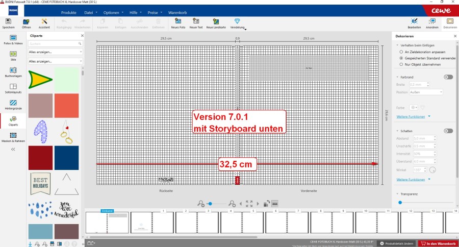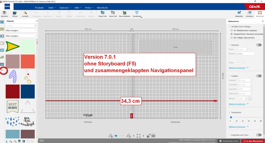 ich kann verstehen, dass die Umgewöhnung etwas Zeit in Anspruch nimmt und das dies anfänglich etwas nervt. Sie werden schon bald die neuste Version zu schätzen wissen. Man kann bekanntlich darüber streiten, welche Änderungen bzw. Verbesserungen als nächstes umgesetzt werden sollen. Einen gemeinsamen Nenner wird man niemals finden. Diese Änderungen waren notwendig, um künftige Wünsche umsetzen zu können. Darunter z.B. das Abdocken der einzelnen Paletten. Bei den Cliparts gibt es derzeit ein Problem, welches wir in der Zwischenzeit korrigiert haben. Die Lösung werden wir mit der Version 7.0.2 zur Verfügung stellen. Sylke Re: Version 7.0.0 bzw. 7.0.1 verbessert?Es wird ja immer mal wieder bemängelt, dass sich der Arbeitsbereich für die Gestaltung des Fotobuchs verkleinert habe.