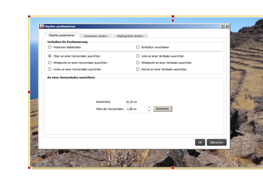 finde ich die Funktion nicht, oder ist es tatsächlich nicht möglich, ein Objekt exakt durch die Eingabe von Koordinaten (z.B. linke obere Ecke x=5mm, y=7mm) zu positionieren? Und ist es ebenfalls nicht möglich, die Größe von Objekten exakt durch die Eingabe von Werten anzugeben (z.B. Länge 6cm, Breite 6cm)? Es ist so unglaublich mühsam, das durch Ziehen mit der Maus zu versuchen... Vor allem finde ich es extrem nervig, dass beim Verändern der Größe beim Ziehen an den mittleren Anfassern (also nicht an den Ecken) sich die Größe trotzdem in beide Richtungen (also Länge und Breite) ändert und nicht eine fest bleibt. Das macht eine exakte Größenbestimmung quasi unmöglich. Über Hilfe wäre ich sehr dankbar. MfG Sabi Re: Exakte Positionierung und Größe von BildernHallo Sabi222,