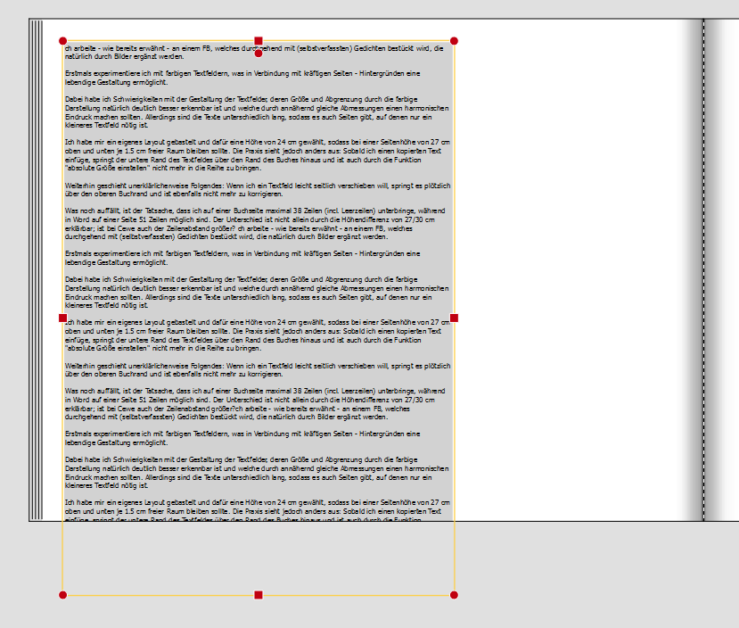 hat geschrieben: Ich habe mir ein eigenes Layout gebastelt und dafür eine Höhe von 24 cm gewählt, sodass bei einer Seitenhöhe von 27 cm oben und unten je 1.5 cm freier Raum bleiben sollte. Die Praxis sieht jedoch anders aus: Sobald ich einen kopierten Text einfüge, springt der untere Rand des Textfeldes über den Rand des Buches hinaus und ist auch durch die Funktion "absolute Größe einstellen" nicht mehr in die Reihe zu bringen.