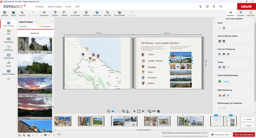 Ich habe auf der rechten Seite Fotos. Eigentlich dachte ich, dass die ja nichts mit der Karte zu tun haben. Von Standort 1 habe ich sie auf 2 und 3 kopiert, um dieselbe Größe zu haben. Dann habe ich die Bilder ausgetauscht. Wenn ich nun ein Foto tauschen möchte, dann springt auf der linken Seite die Karte und wird kleiner. (siehe Bild 1 und Bild 2) Also die Möglichkeit einer Sperrung der Seite wäre da schon wirklich sinnvoll. Ich werde es nun wirklich so machen, dass ich zuerst die rechte Seite fix und fertig mache und mich dann erst an die Karte wage. So wirklich glücklich bin ich nicht damit. Bei früheren Büchern habe ich einfach mit Google Map gearbeitet, das war viel einfacher. Ich dachte, die Funktion wird angeboten, dann ist das sicher eine Erleichterung. Auch im Video klingt das so einfach, aber auf diese Sprünge wird nicht hingewiesen. Da sollte evtl. mal nachgearbeitet werden. Bin ich die Einzige, bei der sowas auftritt? LG Monika
