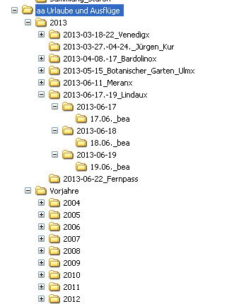 Gesichert werden meine Bilder nach dem Aussortieren des Mülls und der Bearbeitung der besseren Fotos auf DVD. Und dann ab und zu wird eine externe Festplatte als Datensicherung aktualisiert. Meine Fotos sind auf einer zweiten Festplatte im PC gespeichert, sortiert nach Kategorie (z.B. Urlaube, Familie, Tiere....). Unterordner gibt es dort, jeweils an erster Stelle das aktuelle Jahr, einen Unterordner mit Jahr-Monat-Tag und Bezeichnung des Ereignisses. (das x am Ende des Namens heißt für mich einfach, dass die Daten schon auf DVD gespeichert wurden, da ich oft bei kleineren Ereignissen abwarte, bis ich genügend Daten für eine DVD habe ) Am Jahresende wird das aktuelle Datei-Jahr in "Vorjahre" verschoben. Z.B.: Liebe Grüße