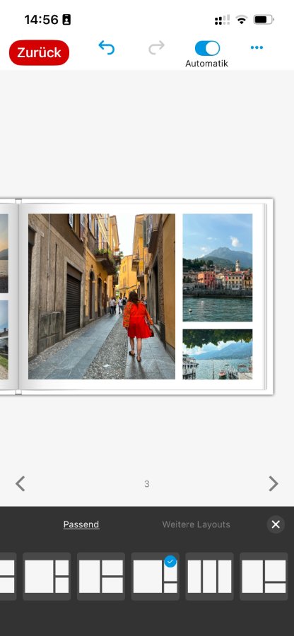 Im unteren Bereich gibt es den Button "Layout". Dort werden Euch verschiedene Layoutvorschläge gezeigt. Ihr könnt die angezeigten Vorschläge mit einem Fingerdruck auswählen und sofort wechselt das Erscheinungsbild zu einer neuen Layoutvariante. Im Anschluss könnt Ihr diese Vorschläge natürlich verfeinern.