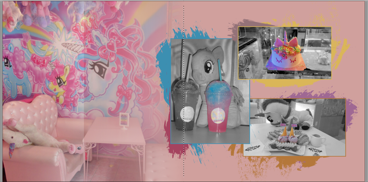 Re: Gewinnspiel: True Colors!Habe mal eine bunte Seite von unserem Besuch im Unicorn Cafe gestaltet. Die "Freistellen"-Funktion von CEWE und ich sind immer noch keine Freunde, werden wir vermutlich auch nicht, hab aber diesmal trotzdem wieder damit gearbeitet, auch wenn es nicht 100% genau geworden ist...