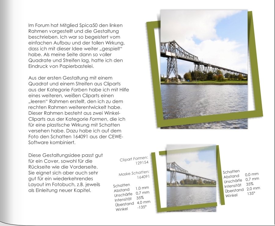 da bin ich aber heftig auf dem Schlauch gestanden! Ich habe ein Bild transparent gemacht und dann den starken hellen Rand drumherum gemacht. Wenn ich dann das Foto draufgezogen habe, war der Schatten auf dem Foto und nicht auf dem hellen Rahmen! Aber jetzt hat es geklappt. Ich möchte alle die lieben Profis gleich mal vorwarnen: jetzt habe ich endlich wieder mal Zeit und ich habe mir vorgenommen, einige der Seiten nachzubauen. Und da werden sicherlich noch einige Fragen auftauchen! Danke für die Hilfe schon jetzt! LG Zaubermaus