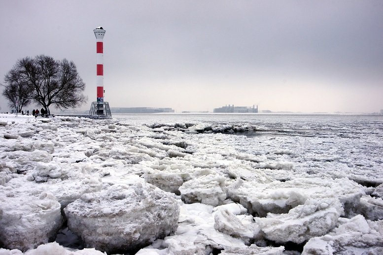 Das Leuchtfeuer Blankeneese mit seinem rot/weißen Anstrich. Der Rest der Welt nur grau in grau.