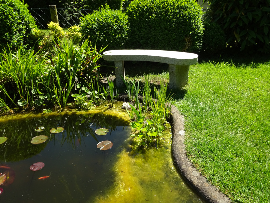 Auf dieser Bank nehme ich gerne Platz, um die Teichbewohner (Fische, Frösche, Kausquappen, Molche, Libellen, Käfer etc.) zu beobachten.