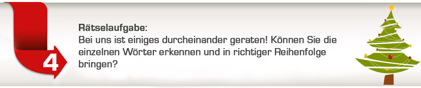 Advent, Advent das vierte Lichtlein brennt – Adventsrätsel der CEWE Fotowelt Der vierte Advent steht kurz bevor und das Weihnachtsfest naht. Heute möchte ich Ihnen das vierte und letzte Adventsrätsel für dieses Jahr präsentieren. Ich hoffe Sie hatten beim Lesen und Teilnehmen Ihren Spaß und sind auch im nächsten Jahr wieder mit von der Partie :-) Gewinn: MyDays Erlebnis-Gutschein „Foto-Shooting“ + 25 Euro CEWE Gutschein Spieldauer: 22.12 - 29.12.2012 Hinweis: Für die Teilnahme an diesem Adventsrätsel ist die richtige Beantwortung des Rätsels erforderlich. Bei mehreren richtigen Antworten entscheidet das Los. Jeder Teilnehmer nimmt unabhängig von der Anzahl der Antworten und Registrierungen im Forum, mit einem Los an einer Verlosung teil. CEWE COLOR vergibt pro Adventsrätsel einen Hauptpreis. Nach Abschluss des wöchentlichen Adventsrätsels wird der Gewinner im Forenbeitrag genannt und schriftlich benachrichtigt. Wir wünschen Ihnen viel Spaß und viel Glück bei unserem 4. Adventsrätsel. Anmerkung: Klicken Sie die Bilder, sofern Sie diese vergrößern möchten. Sylke Re: Rätsel: Advent, Advent das vierte Lichtlein brenntNicht vergessen: Die Laufzeit des Rätsels beginnt erst in 2 Tagen