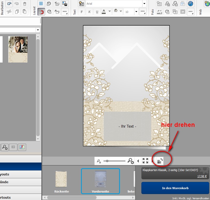 Re: Format Klappkarte Klassik VarioDie Seitenansicht lässt sich kippen, dass die Karte aufrecht steht. (Drehsymbol unter der Karte) Wenn ein Foto eingefügt wird, muss man dieses, abhängig vom Format, evtl. auch entsprechend drehen, dass es in der richtigen Richtung steht. (über der Karte: Foto im Uhrzeigersinn drehen)