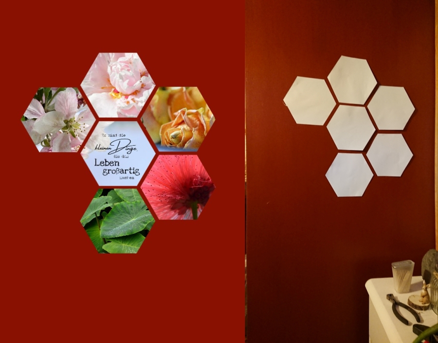 Sie hängt an der Zwischentür im "Windfang" und ich musste auf wärmeres Wetter warten, weil ich zuerst die Tür streichen wollte. Wie auch bei der ersten Gestaltung habe ich mir zuerst Sechsecke aus Papier ausgeschnitten, um die Positionierung an der Tür zu testen. Dafür habe ich dieses Mal einfach die Aussparung in der Verpackung nachgezeichnet. Ursprünglich wollte ich die Gestaltung so aufhängen: Also habe ich kurzerhand auf meine bewährte vorherige Gestaltung zurückgegriffen und diese Anordnung fand ich auch hier viel interessanter. So sieht es jetzt aus und ich denke, es ist ein netter Empfang. Ich bin ganz verliebt Übrigens, mit den zwei Abstandshaltern, die ich ja inzwischen habe, war das Ausrichten ein Kinderspiel Liebe Sylke, gib das doch bitte nochmal an die Verantwortlichen weiter. Es wird doch nicht zum finanziellen Zusammenbruch des Unternehmens führen, wenn man wenigstens in zwei Packungen jeweils einen Abstandshalter packt. Hat inzwischen schon jemand anders die hexxas ausprobiert? Ich bin ja nicht neugierig, aber eure Gestaltungen würden mich sehr interessieren liebe Grüße