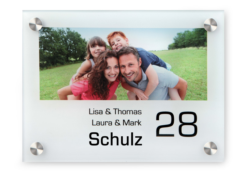 Sie wollen Ihre Gäste auf ganz persönliche Art begrüßen? Verfassen Sie zum Beispiel Ihre individuelle Begrüßung oder stellen Sie Ihre Familie bereits vor dem Klingeln visuell dem Besucher vor. Wir erstellen für Sie Ihr individuelles Foto-Türschild. Maße: 15 x 20 cm Material: 5 mm starkes Acrylglas Empfohlene Auflösung: 1555 x 1045 Pixel Licht/UV- und Feuchtigkeitsbeständigkeit: UV-Beständigkeit ist über mehrere Jahre hinweg gewährleistet. Außerdem ist das Türschild feuchtigkeitsbeständig und damit auch im Außenbereich einsetzbar. In Kürze auf den Webseiten Ihres Partners erhältlich!