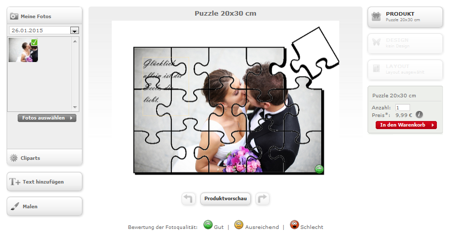 Ob nun kleine oder große Überraschung, jeder Verliebte freut sich an Valentinstag über eine Geste der Zuneigung. Doch das muss nicht immer ein Blumenstrauß oder ein Besuch im Restaurant sein. Werden Sie kreativ und verschenken Sie Ihre persönlichen Liebesbotschaften als doch zur Abwechslung Puzzle! Puzzle finden Sie bereits seit langem bei unseren Fotogeschenken. Dabei bieten wir Ihnen eine Auswahl von Formaten und Teilanzahlen, zwischen denen Sie wählen können. Die folgenden Puzzle finden Sie in unserem Sortiment: Puzzle 20x30 (112 Teile) Puzzle 30x45 (266 Teile) Puzzle XXL (551 Teile) Sowie ein Puzzle mit 500 (47,5 x 32 cm) oder mit 1000 (65 x 47,5 cm) Teilen. Eine Liebesbotschaft gestalten Ob nun zum Valentinstag oder auch zum Jahrestag, können Sie auf diesen Formaten Ihre ganz persönlichen Liebesbotschaften platzieren. Nutzen Sie dafür eines Ihrer lieblings Fotos und platzieren Sie darauf einen Spruch, ein Zitat oder vielleicht sogar ein kurzes Gedicht. Sie können das Bild für Ihr Puzzle entweder in der CEWE Fotowelt (Puzzle 20x30 und 30x34) oder online gestalten. Ein Puzzle können Sie vor allem verschenken, wenn Sie den Valentinstag nicht gemeinsam verbringen können. Wenn zum Beispiel Ihr Partner den Tag alleine zu Hause verbringt, können Sie ihm oder Ihr so eine besondere Freude machen. Hinterlassen Sie das Puzzle als Geschenk verpackt an einem offensichtlichen Ort. Legen Sie einen kleinen Brief dazu und sobald Ihr Partner das Geschenk entdeckt, ist Ihre Überraschung gelungen. Wenn Sie noch ein wenig mehr Zeit haben, können Sie Ihr Puzzle auch bereits einmal vorpuzzleln, um auf der Rückseite eine handgeschriebene Botschaft zu verstecken, wie zum Beispiel eine Einladung ins Kino oder eine andere romantische Überraschung. Aber vielleicht haben Sie bereits eine andere kreative Idee, die zu unseren Fotopuzzlen passt. Was auch immer Sie für Ihren Valentinstag vorbereiten oder planen, wir wünschen Ihnen einen romantischen Tag! Haben Sie weitere Fragen oder Ideen bezüglich unserer Puzzle dann schreiben Sie uns einfach eine Antwort in diesem Beitrag. Zuletzt als neu markiert von Sonja am 02.02.2015, 10:45. Liebe Grüße
