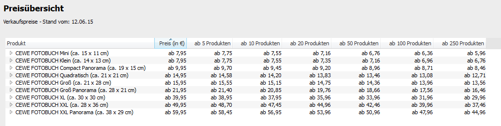 wir bieten einen Preisnachlass für identische Fotoprodukte an. Das heißt, wenn Sie Ihrem erstellten CEWE FOTOBUCH zum Beispiel 5 Exemplare bestellen möchten, haben Sie die bereits die erste Rabattstufe erreicht. Der Rabatt wird Ihnen automatisch von der Gesamtsumme Ihrer Bestellung abgezogen. In der Software können Sie diese Staffelung in der Preisliste einsehen oder sich den Preis mit dem Preiskalkulator berechnen lassen. Auszug Preisliste: Sylke Re: PreisgestaltungHallo Sylke!