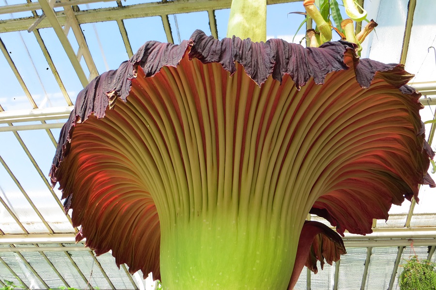 In der Nacht ist die Titanenwurz aufgeblüht. Sie gilt als größte Blüte der Welt und blüht nur zwei Tage. Deshalb hat der Botanische Garten München heute und morgen bis 24.00 Uhr geöffnet. Am ersten Tag blühen die weiblichen Blüten auf (heute an Fronleichnam), am zweiten die männlichen. Der Botanische Garten hat rund 20 Jahre (!) gebraucht, um diese Pflanze zur Blüte zu bringen. Die Blüte hat einen Durchmesser von etwa einem Meter, der Pflanzenkolben in der Mitte ist 1,75 Meter hoch. Die Blüte ist mit starkem Aasgeruch verbunden, wer aber die Toiletten auf der Wiesn übersteht, braucht hier keine Befürchtung zu haben. Der Gestank hält sich meiner Meinung nach in Grenzen. Also wer Lust hat, hat bis morgen Nacht noch eine Chance! Re: Challenge 05/2016 • Teil des GanzenAuch eine Teilansicht der Titanenwurz. Dieses Schauspiel wollte ich mir nicht entgehen lassen.