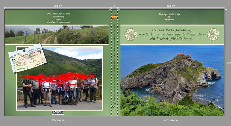 Dazu bin ich mittlerweile auch übergegangen, zumind. bei den Reisebüchern. Bei Familienfeiern nicht, die mache ich anlassbezogen, Jahrbücher mache ich gar nicht. Wobei ich die Einbände schon in unterschiedlichen Farben gestalte, allerdings von der Machart einen Stil gefunden habe, der mir gut gefällt. Hier mal ein Beispiel eines bereits gedruckten Buchs. Wer den Jakobsweg bzw. die Wegmarkierungen nicht kennt, wird sich über die Ausrichtung der Muscheln wundern, aber die offizielle Wandermarkierung ist eine Muschel mit der Öffnung auf der Seite. Ich wollte es genauso und nicht mit der Muschel mit Öffnung nach unten, wie man sie halt klassisch darstellen würde. Für mich sind auch die Infos zur Reise selbst auf dem Cover ein "Muss" - auch wenn das viele anders sehen. Auch unser Gruppenfoto auf der Rückseite hätte ich lieber über die ganze Seite gezogen so wie auf der Vorderseite, aber da passten die Prportionen der Personen nicht mehr - aber dieses Foto sollte unbedingt hinten drauf. Diese Art der Gestaltung habe ich inzwischen mehrfach verwendet, allerdings in verschiedenen Farben. Ich mag am liebsten blau :-) geepping hat geschrieben: würde ich mich über alle Maßen freuen, wenn Du Dich weiterhin zu den Werken, die ich hier poste, äußern würdest. Ich möchte Dich hiermit explizit darum bitten.