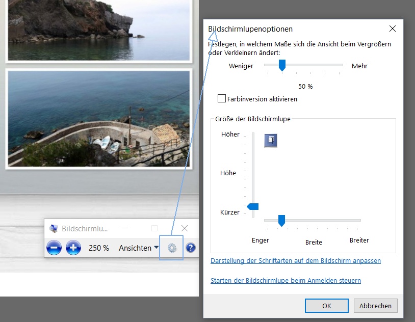 Ich verwende daher bei Bedarf die windows Bildschirmlupe. Man kann sie per Tastenkürzel aktivieren: Mit der Windows-Taste und + aktiviert und steuert man sie in der Größe (bzw. [Win]+[-] ). Mit [Win]+[Esc] schaltet man sie wieder aus. Dabei wird allerdings auch die Vollbildansicht des Kundenbeispiels ausgeschaltet. Im Einstellungen-Dialog (über das kleine Lupensymbol erreichbar), kann man verschiedene Optionen einstellen. Ich habe in "Ansichten" "Lupe" eingestellt und bei "Optionen" 50%-Schritte. Dann bewirkt jeder plus- oder minus-Klick eine 50%ige Vergrößerung. Wenn ich die Ansicht oder die Optionen einstellen will, stelle ich die Lupe zuerst mit [Win]+[-] auf 100%. liebe Grüße